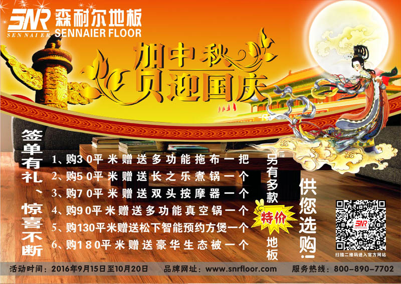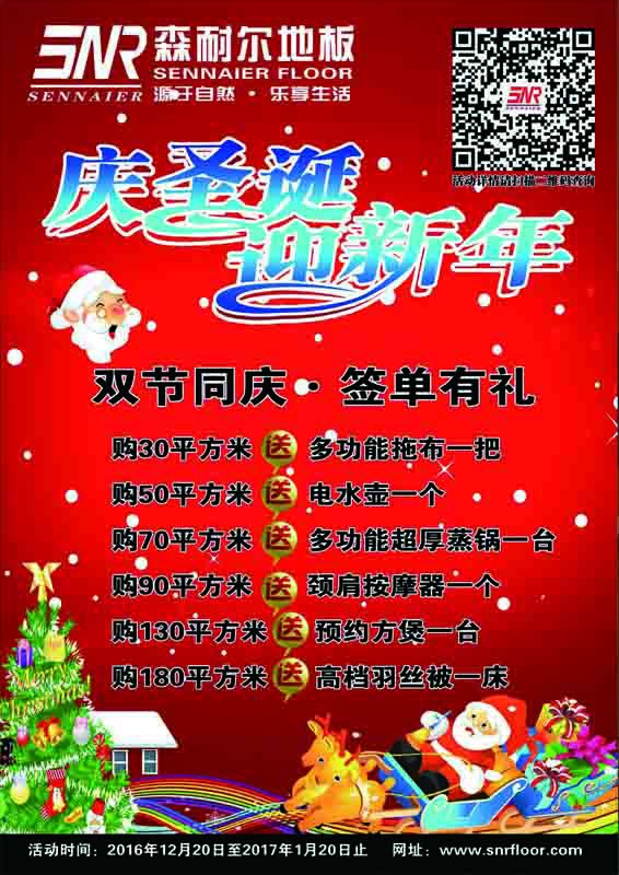 2016年森耐爾地板圣誕元旦促銷活動正式開啟了,活動時間2016年12月20日至2017年1月20日止!具體內容如下. 購30平方米送 多功能拖布一把 購50平方米送 電水壺一個 購70平方米送 多功能超厚蒸鍋一臺 購90平方米送 頸肩按摩器一個 購130平方米送 預約方煲一臺 購1。。。